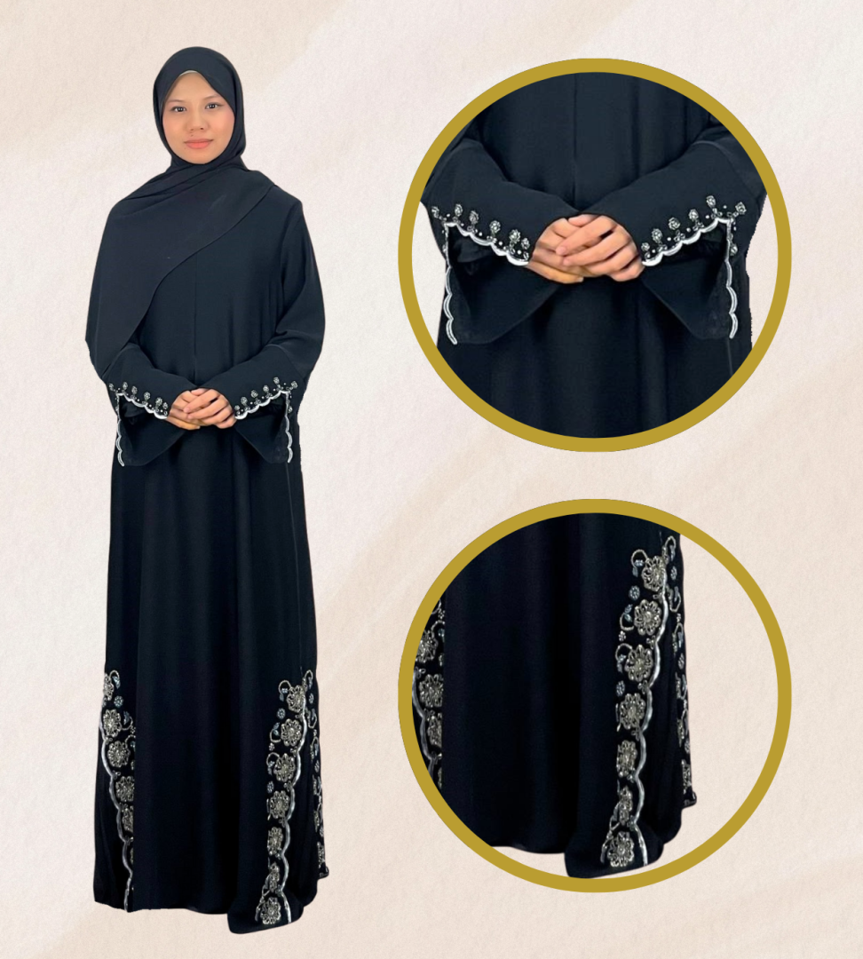 The abaya’s exclusive Nyda design is crafted with a touch of boutique workmanship. Premium fabrics are carefully selected to ensure quality and comfort. The pleated detailing on the skirt adds sophistication, while the exclusive blue bead stitching and piping on the sleeves and skirt enhance its elegance.