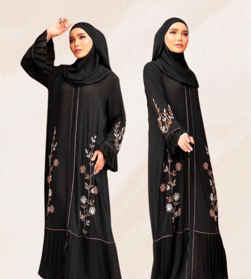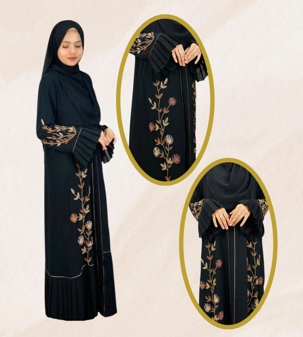 The abaya’s exclusive design is crafted with a touch of boutique workmanship. Premium fabrics are carefully selected to ensure quality and comfort. The pleated detailing on the skirt and sleeves adds sophistication, while the exclusive bead stitching enhances its elegance.