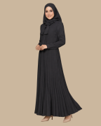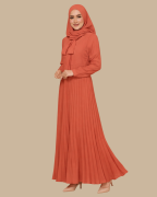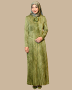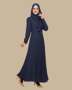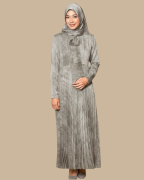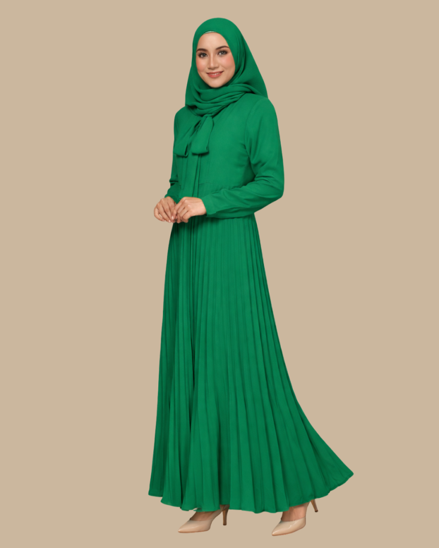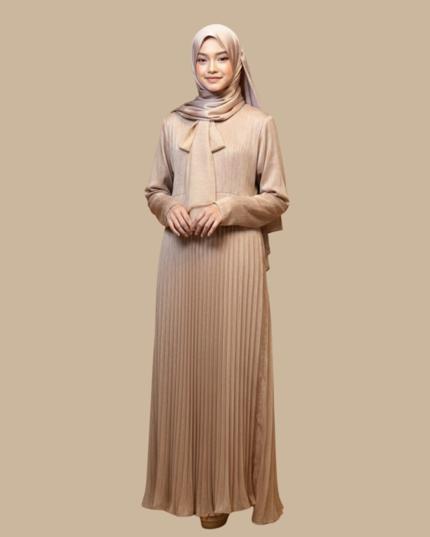 Dress ini dihiasi dengan reben di bawah leher, pleat elegan pada skirt, dan zip di kedua-dua lengan, sentuhan praktikal yang menambah gaya dan kemudahan.